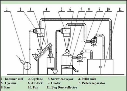 Keterangan Gambar: 1) Ketam Kayu; 2) Mesin Lumat (serbuk); 3) Bin (alat tampung); 4) Pengering; 5) Mesin pelet; 6) Pendingin; 7) Mesin Pengepakan.