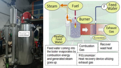 - Kondensor ditambahkan untuk mendaur ulang limbah panas dari asap yang sudah habis untuk meningkatkan suhu air umpan dan mengurangi suhu emisi gas buang dan meningkatkan efisiensi termal di atas 98% dan menghemat biaya pengoperasian